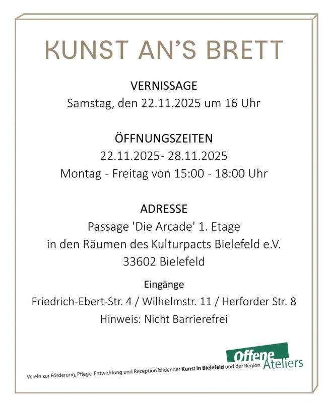 Und nicht nur das Ausstellungsformat ist ungewöhnlich, auch der Ort dieser künstlerischen Schau. Der Bielefelder Kulturpact e.V., der seit kurzem Räume in der Bielefelder Passage ‚Arcade‘ bezogen hat, stellt dem Verein Offene Ateliers einen Raum für diese Ausstellung zur Verfügung.